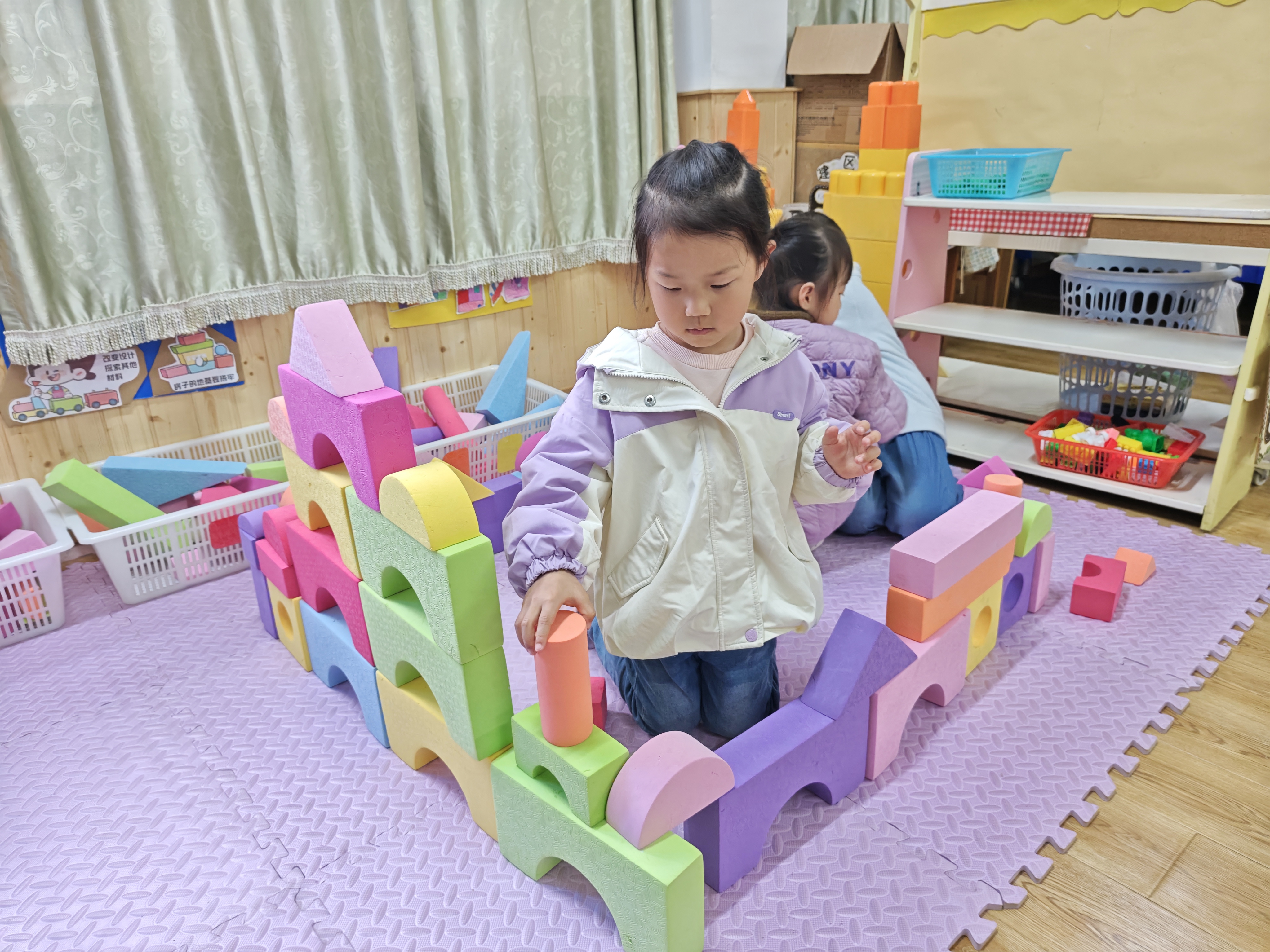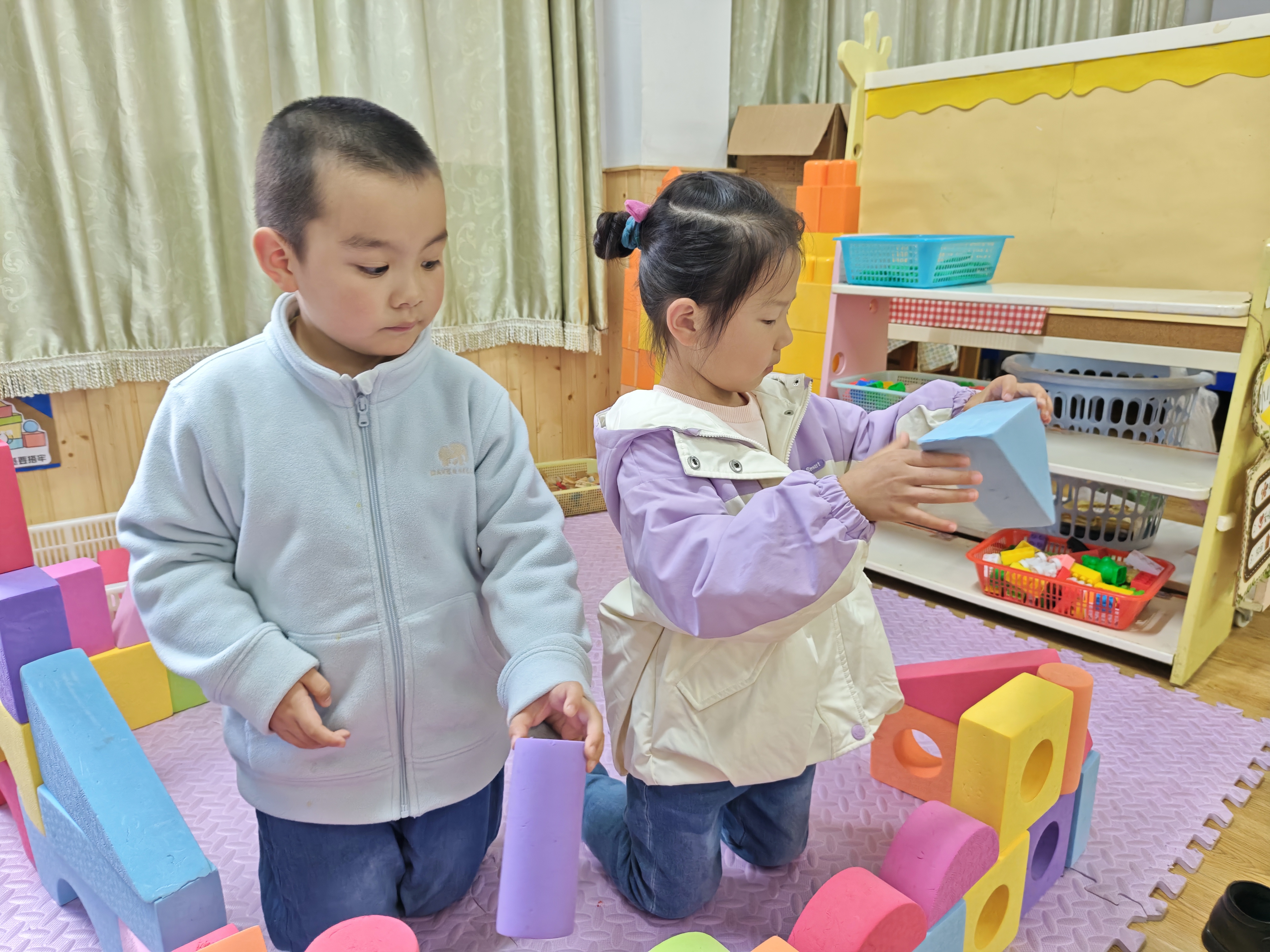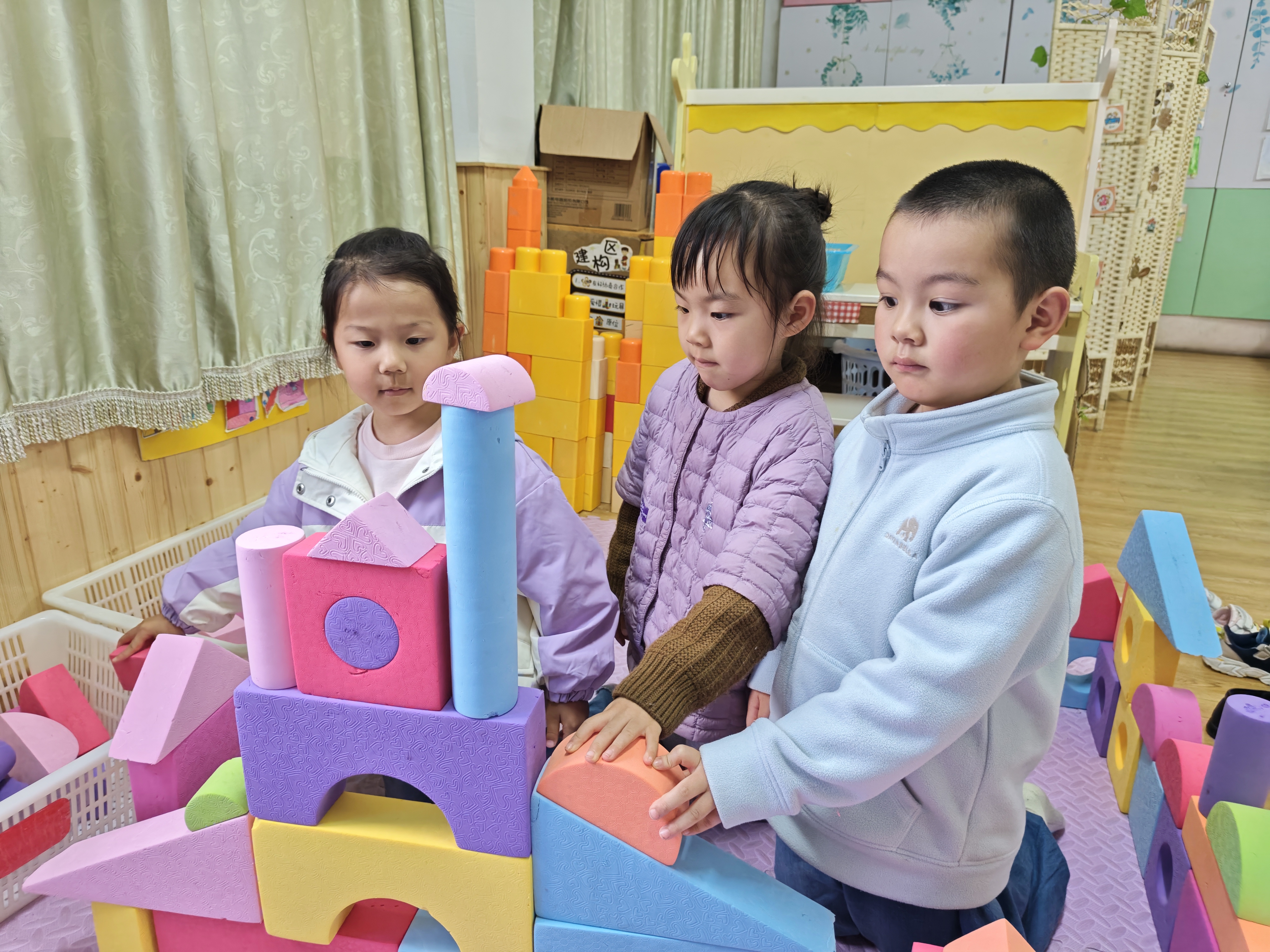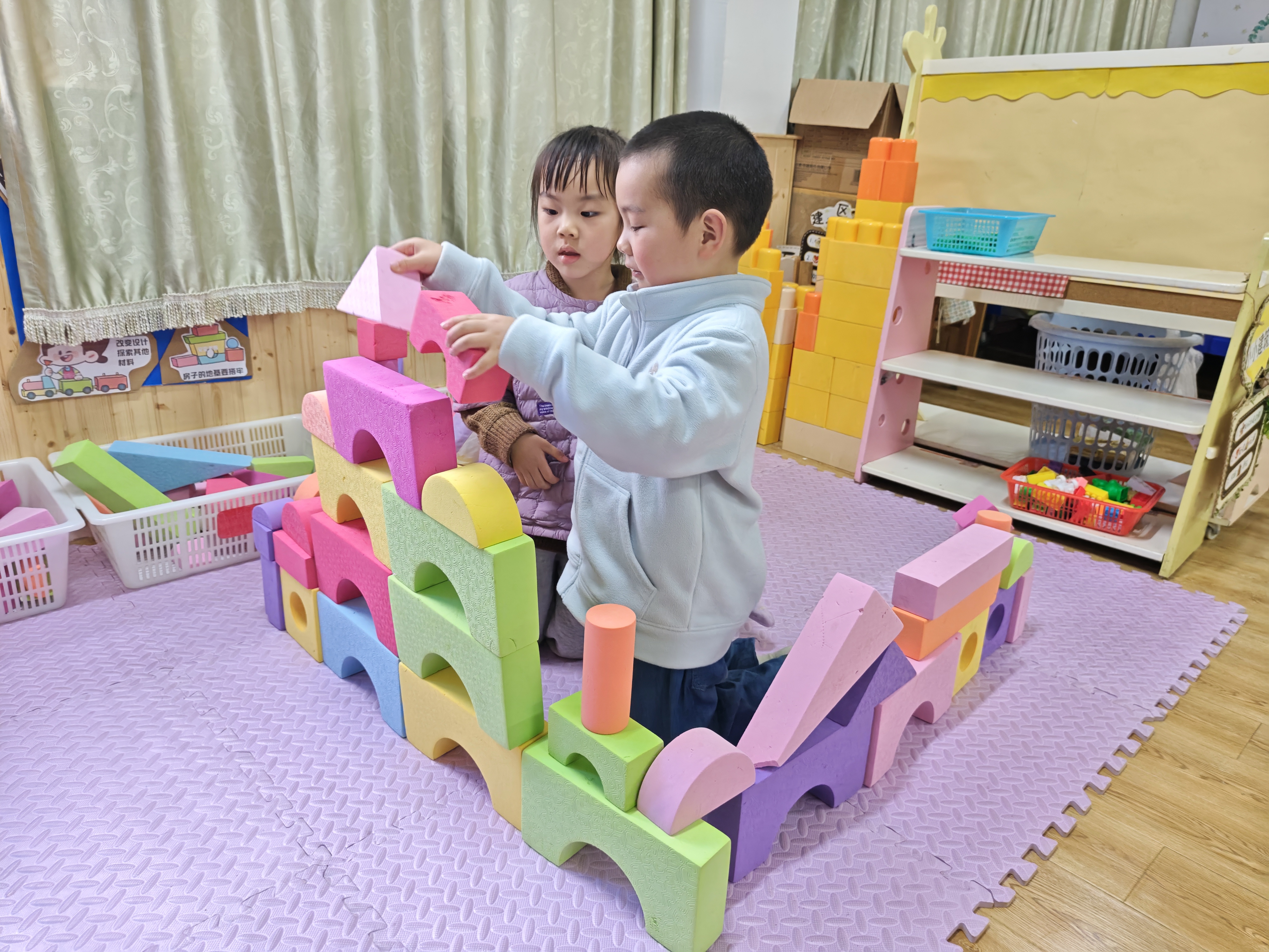 积木搭建,快乐无限。小手拼搭创意,合作收获成长,在搭建中探索,在游戏中进步。