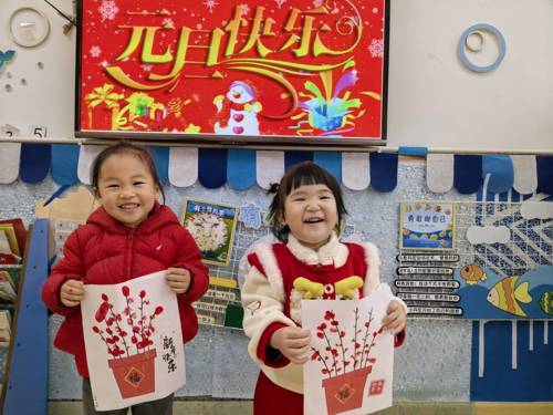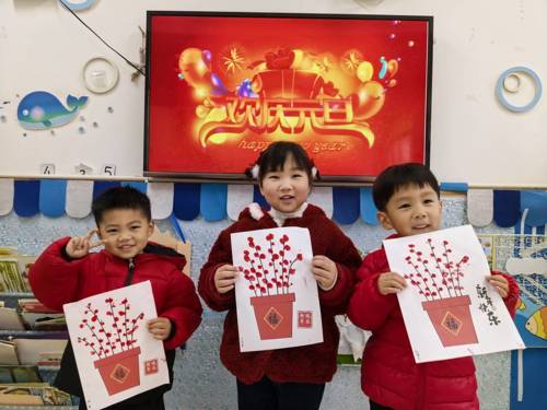 对着镜头比耶,身后屏幕上的“欢庆元旦”都跟着亮了起来。原来最可爱的新年,就是小朋友们把认真和欢喜,都揉进这一点点、一抹抹的红色里呀!