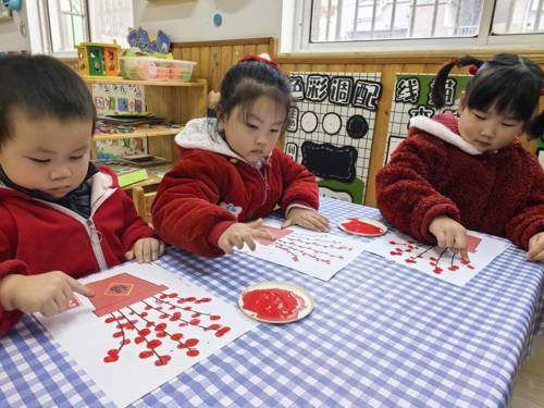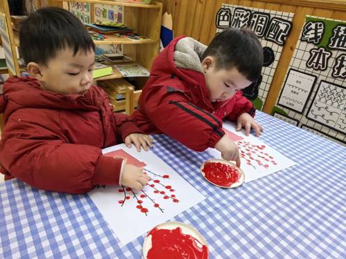 幼儿园的元旦氛围已经甜到冒泡泡啦!看这几个小家伙,小手蘸着红颜料,认认真真在纸上点出一簇簇:年宵花,每一个圆滚滚的红点点,都是他们眼里最热烈的新年模样。